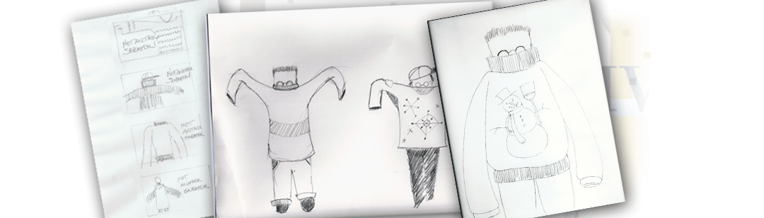 After confirmation of the brief, budget and delivery date, we came up with some rough concepts. Roughs are quick ideas for layouts Some jobs don't require roughs, but we usually do them for personal reference. The client liked our suggestion to try something around giving an oversized sweater so all the roughs revolved around this central idea.
